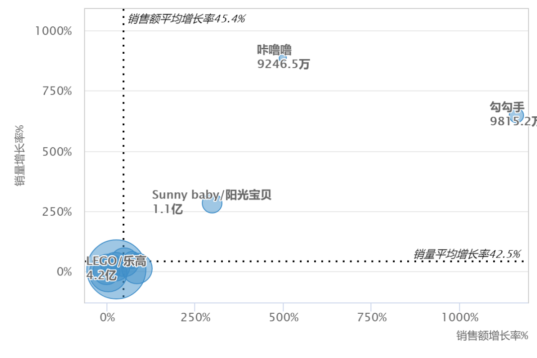 數(shù)據(jù)顯示,LEGO/樂高、LDCX/靈動(dòng)創(chuàng)想、disney/迪士尼、KUB/可優(yōu)比、育兒寶品牌銷量和銷售額穩(wěn)定增長;咔嚕嚕、勾勾手銷售額、銷量增速驚人;Sunny baby/陽光寶貝銷售額增速放緩。