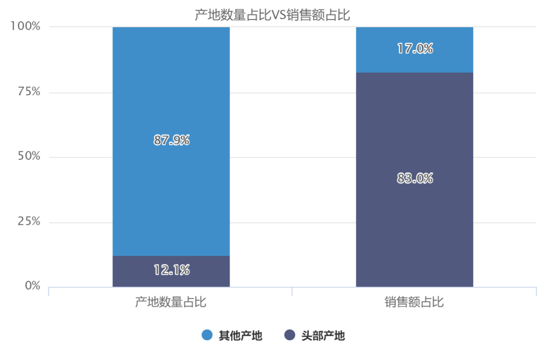 線上海外品牌玩具產(chǎn)地呈頭部現(xiàn)象,約12.1%的頭部產(chǎn)地貢獻(xiàn)了約83.0%的海外品牌銷售額。