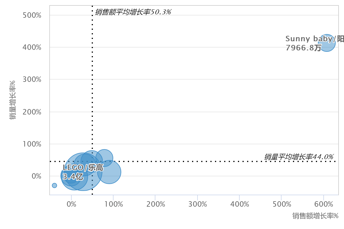 在品牌競(jìng)爭(zhēng)格局中,值得一提的是,在眾多品牌銷售額的增長(zhǎng)率低于100%的情況下,sunny baby銷售額增長(zhǎng)率高達(dá)600%,增長(zhǎng)速度驚人,但其7966.8萬的銷售額,想要趕超樂高3.4億銷售額,還需要很長(zhǎng)的路要走。
