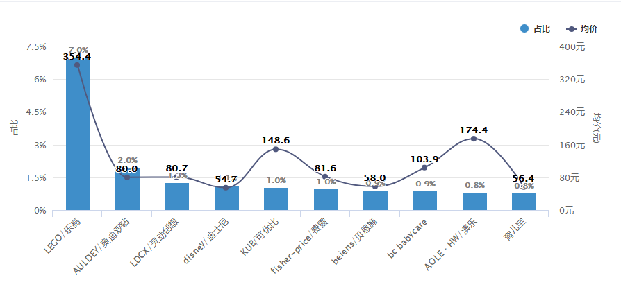 作為全球玩具市場(chǎng)龍頭企業(yè),樂高在中國市場(chǎng)依然表現(xiàn)不俗,長(zhǎng)期占據(jù)銷量榜首。整體來看,樂高價(jià)格高于前10品牌平均價(jià)格119.3元,直以來樂高的積木顆粒和玩樂系統(tǒng)都是業(yè)務(wù)的核心,玩樂可以培養(yǎng)孩子的學(xué)習(xí)能力,對(duì)孩子的健康成長(zhǎng)很有必要。