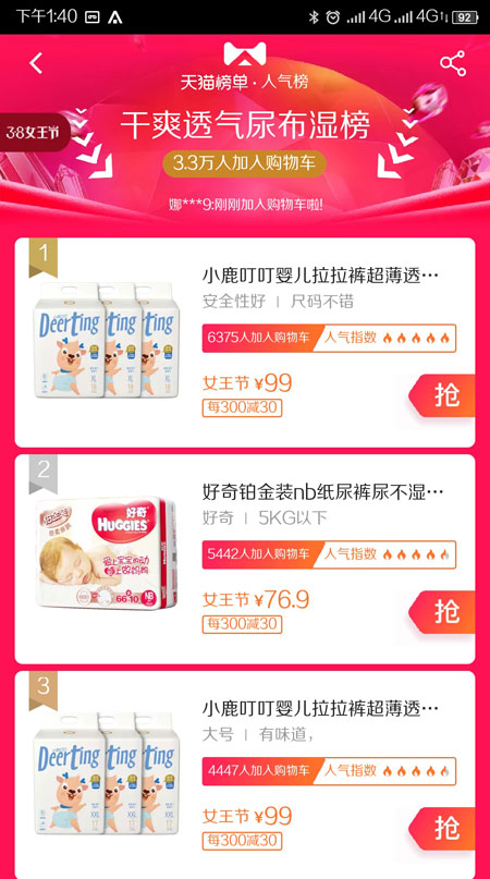 38女王節(jié)尿布濕人氣榜:小鹿叮叮兩款紙尿褲位列前三