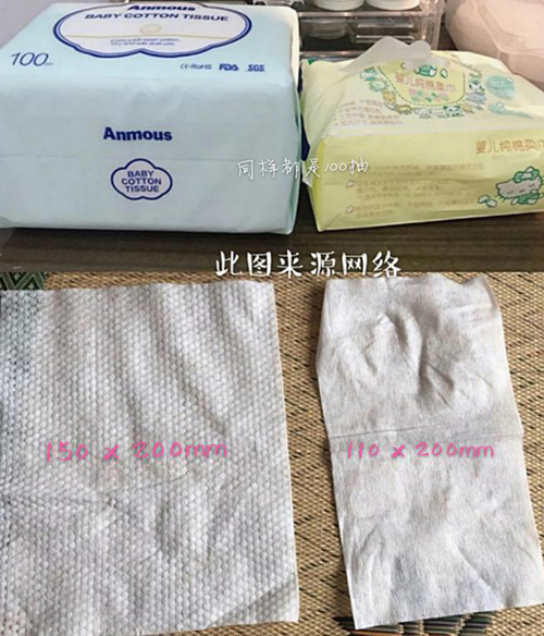 安慕斯棉柔巾之所以這么受歡迎,是因?yàn)榘材剿姑奕峤碛执笥趾袂夷陀?,每次使用時(shí)一張剛剛好。據(jù)官方數(shù)據(jù)顯示,安慕斯棉柔巾每張尺寸為150×200mm,對(duì)比同樣每包100抽全棉時(shí)代棉柔巾要大很多。而全棉時(shí)代棉柔巾每張尺寸為110×200mm,全棉時(shí)代不僅面積小且薄,一般使用情況下都要2張起步,容易造成浪費(fèi)。(如下圖)