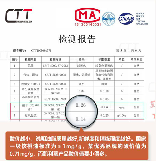 在給寶寶挑選核桃油時,一定要看核桃油的兩大質(zhì)量指標(biāo),核桃油的酸價和過氧化值。酸價代表核桃油主要的脂肪被其他微生物分解產(chǎn)生的游離酸含量,酸價越小,說明油脂質(zhì)量越好,雜質(zhì)越少,口感越新鮮。經(jīng)第三方檢測機構(gòu)檢測,凱利蔻核桃油的酸價值為0.26mg/g,國家一級核桃油標(biāo)準(zhǔn)是≦1mg/g,是符合國家一級標(biāo)準(zhǔn)好油。過氧化值用來判斷核桃油質(zhì)量和變質(zhì)程度,值越低。油脂氧化程度越低,變質(zhì)程度越低,所以核桃油質(zhì)量就越高。