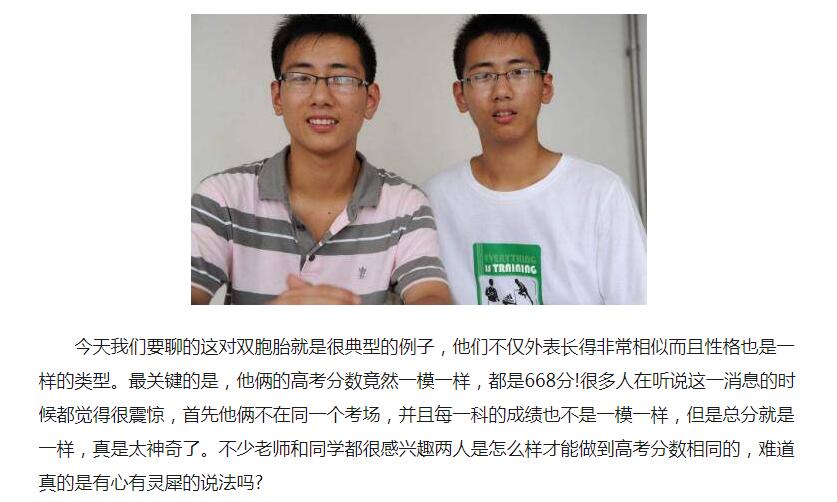 親貝網(wǎng)小編今日從社交平臺獲悉,近10年有超10對雙胞胎高考分數(shù)相同,所謂的心有靈犀真不是吹的,要不一方有難另一方會有感應(yīng),而且雙胞胎做事也都是神相似,這也許從科學(xué)角度上講,基因里帶有某些一樣的要素。