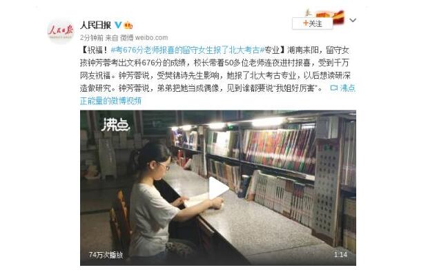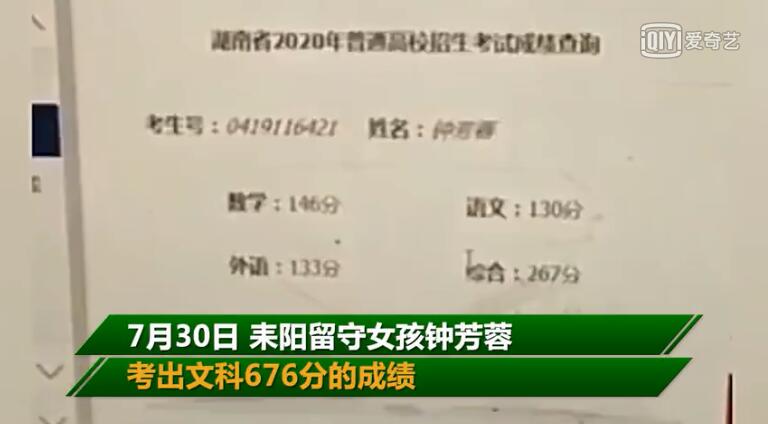 湖南耒陽(yáng),留守女孩鐘芳蓉考出文科676分的成績(jī),校長(zhǎng)帶著50多位老師連夜進(jìn)村報(bào)喜,受到千萬(wàn)網(wǎng)友祝福。鐘芳蓉說(shuō),受樊錦詩(shī)先生影響,她報(bào)了北大考古專(zhuān)業(yè),以后想讀研深造做研究。鐘芳蓉說(shuō),弟弟把她當(dāng)成偶像,見(jiàn)到誰(shuí)都要說(shuō)“我姐好厲害”。
