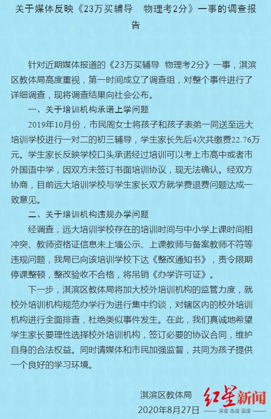 據(jù)“鶴壁市淇濱區(qū)教體局”微信消息,針對近期媒體報(bào)道的《23萬買輔導(dǎo) 物理考2分》一事,河南淇濱區(qū)教體局高度重視,第一時(shí)間成立了調(diào)查組,對整個(gè)事件進(jìn)行了詳細(xì)調(diào)查,現(xiàn)將調(diào)查結(jié)果向社會公布。