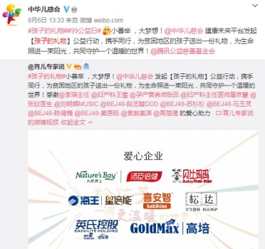 據了解,本次愛心公益活動更有多位明星、母嬰專家與KOL以及企業(yè)愛心助力,攜手同行為貧困地區(qū)的孩子們送出一份禮物。孩子的成長不能等,讓我們一起為愛加油,給邊遠鄉(xiāng)村的孩子送上一份健康的禮物,給孩子一個更溫暖的世界!