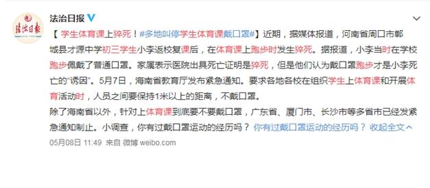 近期,據(jù)媒體報道,河南省周口市鄲城縣才源中學初三學生小李返校復課后,在體育課上跑步時發(fā)生猝死。據(jù)報道,小李當時在學校跑步佩戴了普通口罩。家屬表示醫(yī)院出具死亡證明是猝死,但是他們認為戴口罩跑步才是小李死亡的“誘因”。5月7日,海南省教育廳發(fā)布緊急通知。要求各地各校在組織學生上體育課和開展體育活動時,人員之間要保持1米以上的距離,不戴口罩。