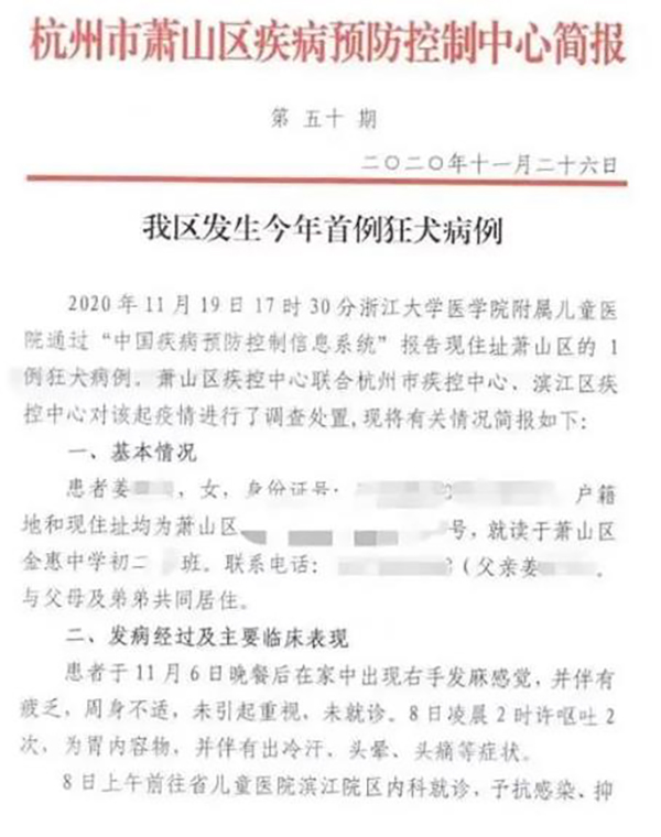 親貝網小編了解到,狂犬病的死亡率非常高,目前有效治療狂犬病的辦法,只能是及時注射疫苗。這幾天,有一則發(fā)生在杭州的新聞。杭州疾控中心發(fā)表了一則聲明,在杭州發(fā)生了一??袢∧X死亡案例,死者系初中二年級的女生。