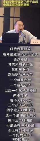 他提到:未來高考只獎勵兩類人,一類是烈士子女,一類是多生孩子的,生一個不給獎勵,生2個給20分,生3個給50分加分,生4個讓夫妻倆決定,選一個最傻的上985,剩下三個聰明的,不是還有50分補貼嗎?全上985,一個媽媽帶著4個985的孩子。
