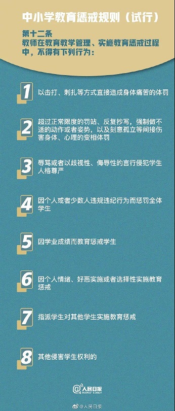《規(guī)則》里還強(qiáng)調(diào),教育懲戒與體罰和變相體罰是不同性質(zhì)的行為,明確禁止了七類不當(dāng)教育行為,劃定教師行為紅線,規(guī)定了對越界教師的處罰方式,方便各方監(jiān)督。