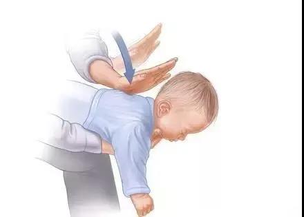 按壓胸部5次:讓寶寶仰臥背貼在家長的大腿上,用中指和食指,放在寶寶胸廓下和臍上的腹部,快速向上壓迫1-5次。
