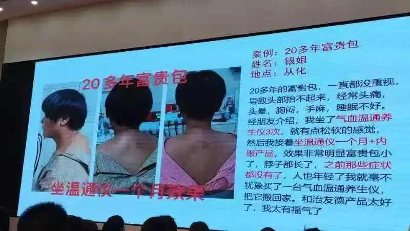但在和治小助手(保慈廈門健康管理有限公司)運營的公眾號里,上述公眾號稱自己為和治友德素材庫。在2024年12月31日發(fā)布的文章中,包括一篇氣血溫通養(yǎng)生儀3.0最新100%真實案例集錦文章,其中包括稱養(yǎng)生儀包括疏通血管、增強免疫力、舒筋通絡(luò)、瘦身減肥、緊致塑形等功能。案例中舉出了多個使用養(yǎng)生儀后病情改善或痊愈的案例。
