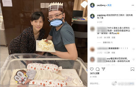 papi醬穿著簡單,素顏的氣色也很不錯,老公手中捧著寫有“升級成功,老胡生快”的生日蛋糕,寶寶在嬰兒床上乖巧躺著,畫面超溫馨!