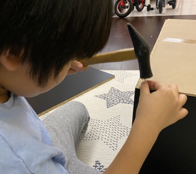 林志穎配文說“三個小幫手一起組裝鞋柜,弟弟們鎖螺絲,哥哥練習(xí)錘釘子,最終完成了,但多出了些螺絲跟釘子,這鞋柜應(yīng)該牢靠吧。”