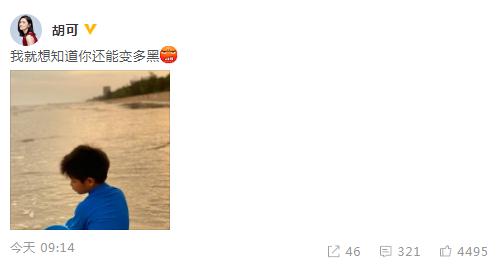 5月25日上午,胡可在微博分享小魚兒在海邊玩沙子的照片,并發(fā)文吐槽:“我就想知道你還能變多黑”。
