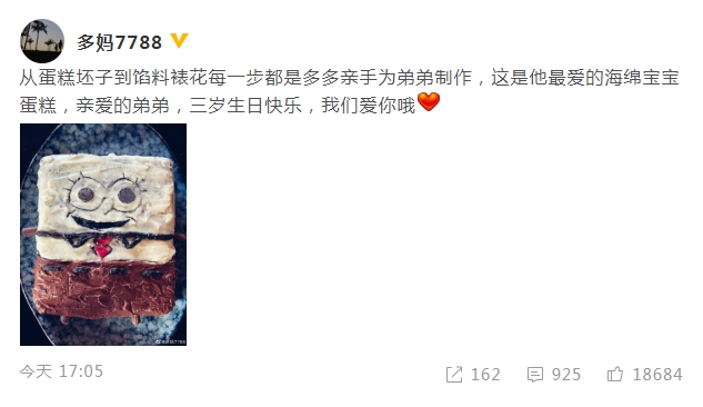 5月27日,孫莉在微博曬出女兒多多為弟弟親手制作的海綿寶寶生日蛋糕,并配文:“從蛋糕坯子到餡料裱花每一步都是多多親手為弟弟制作,這是他最愛的海綿寶寶蛋糕,親愛的弟弟,三歲生日快樂,我們愛你哦”。照片中多多做的海綿寶寶蛋糕的表情十分傳神,網(wǎng)友直呼道“還有什么是多多不會(huì)的!”