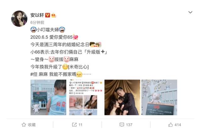 因?yàn)?月5號(hào)是安以軒和老公的結(jié)婚紀(jì)念日,他們結(jié)婚三年了,所以安以軒選擇在這一天的13點(diǎn)14宣布自己有二胎的喜訊,結(jié)婚三年,現(xiàn)在有了第二個(gè)孩子,夫妻兩個(gè)幸福滿滿。