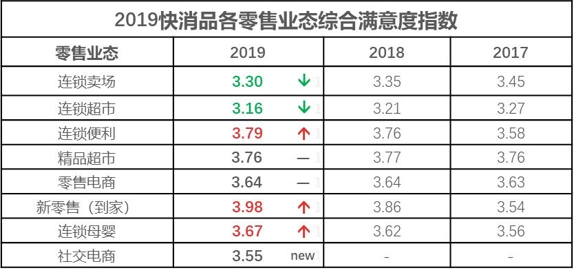 分?jǐn)?shù)下降的兩大業(yè)態(tài)分別是連鎖賣場(chǎng)和連鎖超市,連鎖賣場(chǎng)的滿意度從2017年的3.45分,降至2018年的3.35分,今年的得分為3.3分。連鎖超市從2017年的3.27分,下降到2018年的3.21分,今年的得分為3.16分。