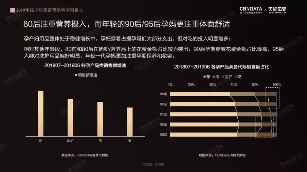 這一代的新生媽媽在孕產(chǎn)育兒后代的同時,有相當(dāng)大的一部分群體要兼顧事業(yè)的發(fā)展。“獨立、體面”也成為了媽媽們的關(guān)鍵詞。從近幾年的孕產(chǎn)用品的消費情況來看,公司白領(lǐng)的人數(shù)占比為最高。90到95后的媽媽在孕婦裝、營養(yǎng)品的消費上增速明顯,產(chǎn)后的塑身衣和瑜伽相關(guān)類更是節(jié)節(jié)攀升,年輕媽媽對孕后身材恢復(fù)的態(tài)度可以說是毫不手軟的消費升級。