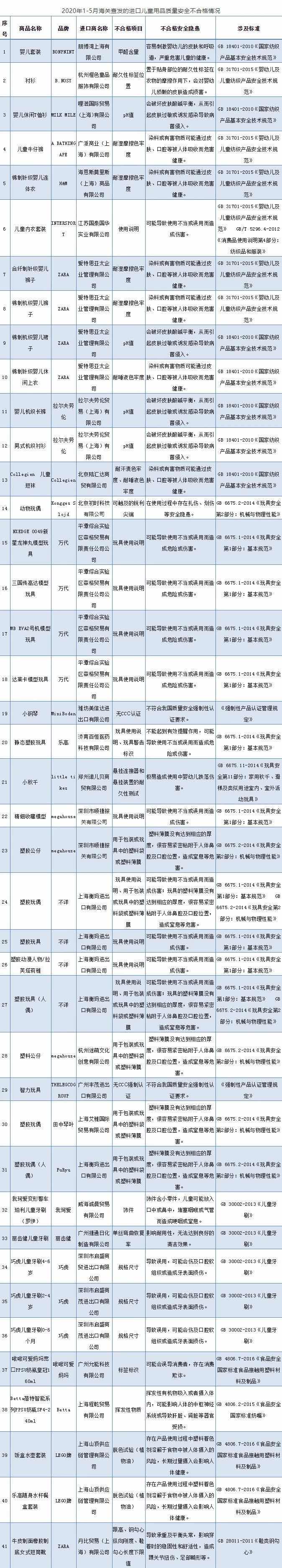 隨著人民生活水平的提高,進(jìn)口兒童用品越來(lái)越受到寶爸寶媽們的青睞,來(lái)自世界各地琳瑯滿目的進(jìn)口兒童用品都是寶爸寶媽眼里的大品牌,據(jù)親貝網(wǎng)小編了解,日前,海關(guān)總署對(duì)外公布2020年1至5月海關(guān)查發(fā)的部分進(jìn)口兒童用品質(zhì)量安全不合格情況,涉及服裝、玩具等6類41批次進(jìn)口兒童用品,包括H&M、ZARA、樂(lè)高、巧虎等品牌。